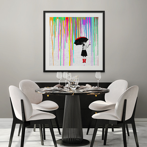Immerse yourself in the captivating scene of a girl sheltered beneath a vibrant cascade, her umbrella a delicate shield from the colorful rain. This meticulously crafted giclée on canvas faithfully reproduces the original masterpiece, showcasing its brilliance and nuanced tones. Crafted with precision using non-toxic water-based inks, its enduring quality ensures its beauty will grace your home, office, or any cherished space for years to come.