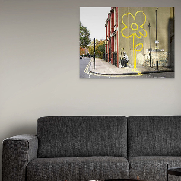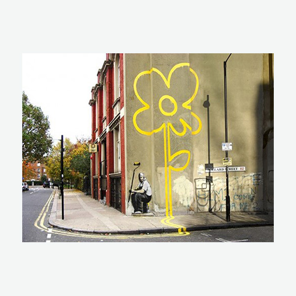 The artwork titled "Yellow Lines Flower Painter," conceived in 2007, can be found nestled in Benthal Green. Positioned on the facade of a bustling working man’s club at the juncture of Pollard Row and Pollard Street, this street art masterpiece portrays a figure clad in overalls, taking respite following the task of adorning the pavement with double yellow lines. These lines metamorphose seamlessly into a vibrant yellow flower, adorning the adjacent wall.