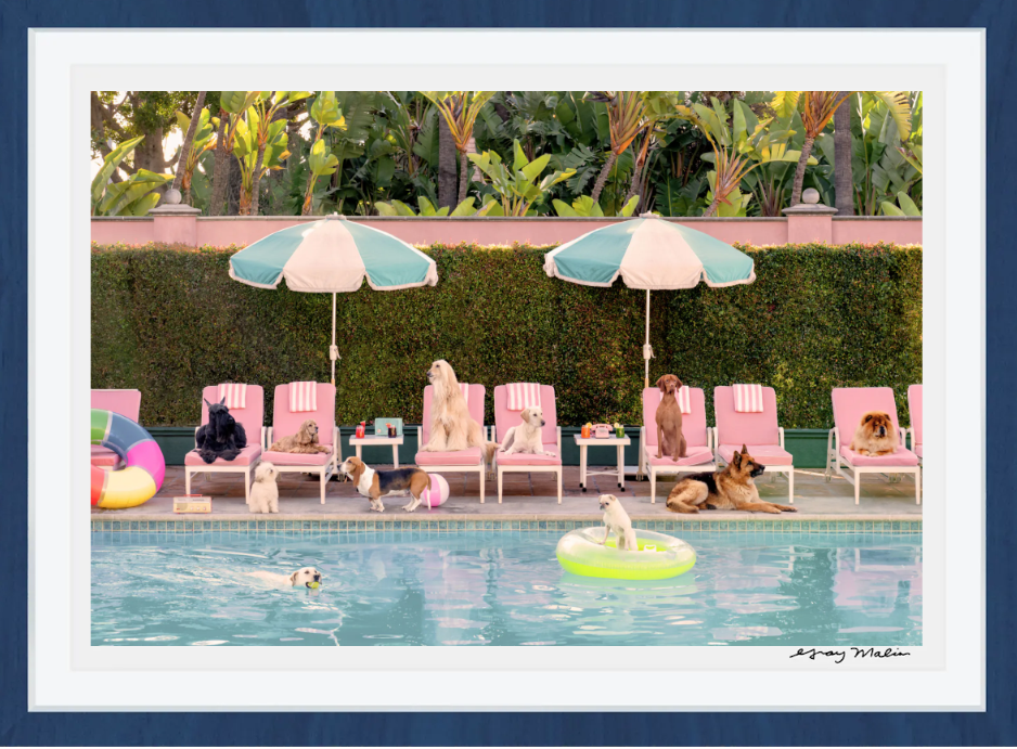 Enjoy sunning or splashing in the water with POOL DAY, THE BEVERLY HILLS HOTEL from Gray’s playful series, Dogs at The Beverly Hills Hotel.